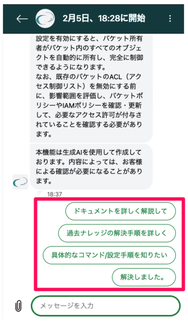 また、AI チャットボットの回答精度を高めるため、ユーザーの入力前に「カテゴリ選択」や「詳細入力フォーム(対象サービス・事象・期待値)」を挟むフローを設計しています。これにより、曖昧な問い合わせに対しても AI が正確に状況を把握し、適切な回答を導き出せる仕組みとなっています。さらに、最初の回答に対して「ドキュメントを詳しく解説して」「過去ナレッジの解決手順を詳しく」「具体的なコマンド/設定手順を知りたい」「解決しました」の4つの選択肢から深掘りできる「ディープダイブ・レスポンス」機能も搭載しました。テキストだけでなくエラー画面のスクリーンショットなどの画像も直接理解できるマルチモーダル対応も実現しています。