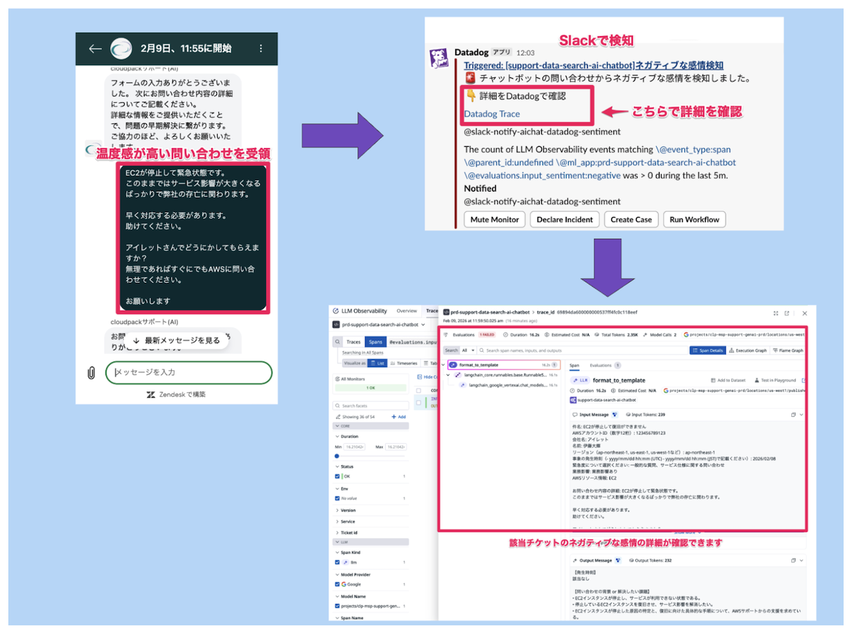 AI で解決できなかった場合は、Zendesk のチケット起票へ移行し、会話履歴をそのまま有人サポートへ引き継ぐ仕組みを構築しています。ユーザーは状況を再説明する必要がなく、エンジニアも AI が調査した前提情報を把握した状態で対応を開始できます。加えて、Datadog LLM Observability を活用した感情分析により、お客様の問い合わせ内容から温度感を検知し、Slack へ即座に通知する仕組みも構築しています。これにより、エンジニアが能動的にサポートへ介入できる体制を整えています。