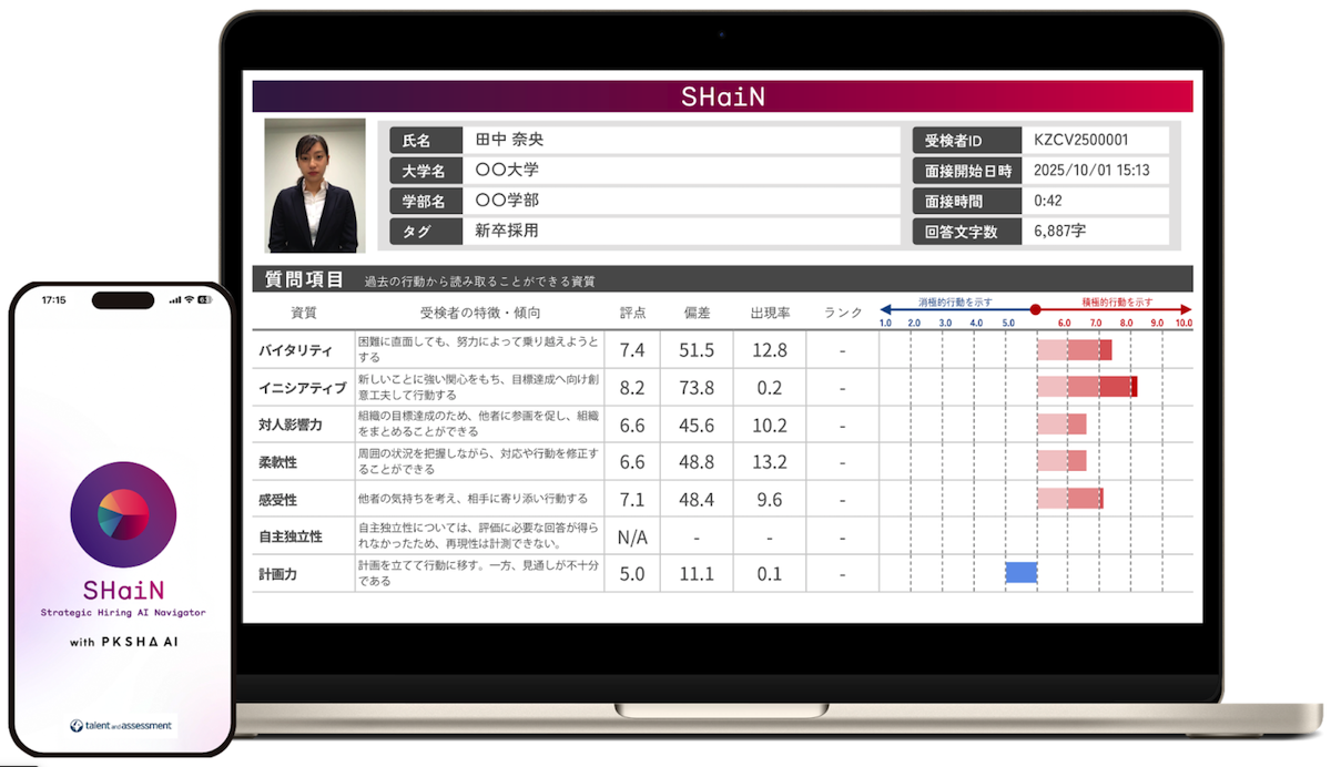 なお、AI 面接の導入においては、株式会社タレントアンドアセスメントが提供する「SHaiN」を採用しました。「SHaiN」は、単なる録画面接ツールではなく、対話型 AI が面接官として機能する先進的なサービスです。東京大学大学院との共同研究によって開発された AI を基盤とし、EU AI 規制法(AI Act)への準拠を表明するなど、公正性と信頼性の確保を重視しています。